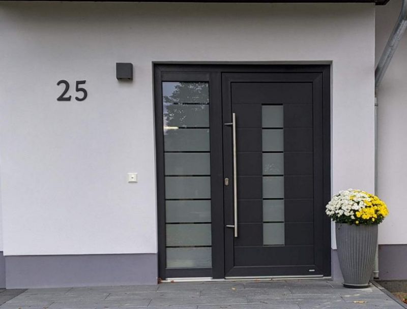 Objekt mit Fenster und Haustüren aus Rehau Profilen Brillant Design 70 in Dekoroberfläche Anthrazitgrau, ausgestattet mit Neubau-Aufsatzkastensystem Rollladen bzw. Raffstore von ALULUX, die Garage mit einem Rolltor CD77 in Graualuminium von ALULUX