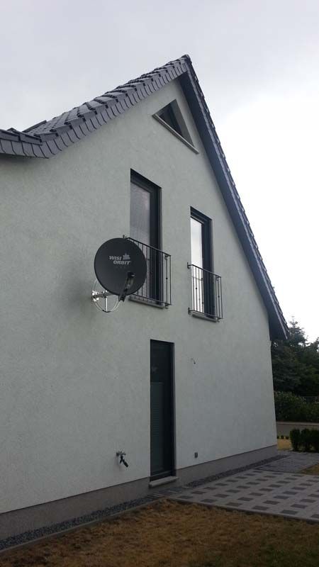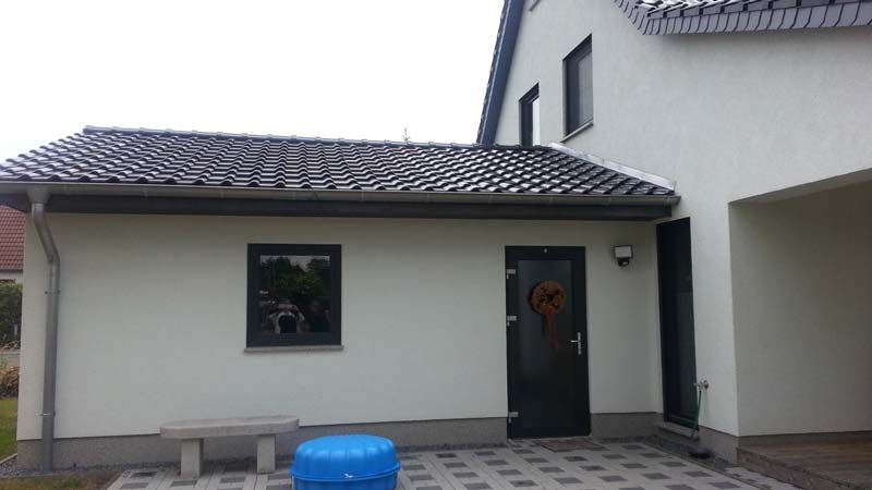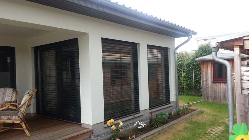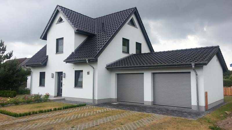 Objekt mit Fenster und Haustüren aus Rehau Profilen Brillant Design 70 in Dekoroberfläche Anthrazitgrau, ausgestattet mit Neubau-Aufsatzkastensystem Rollladen bzw. Raffstore von ALULUX, die Garage mit einem Rolltor CD77 in Graualuminium von ALULUX